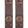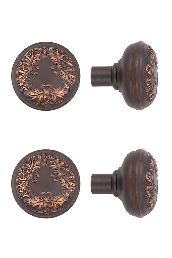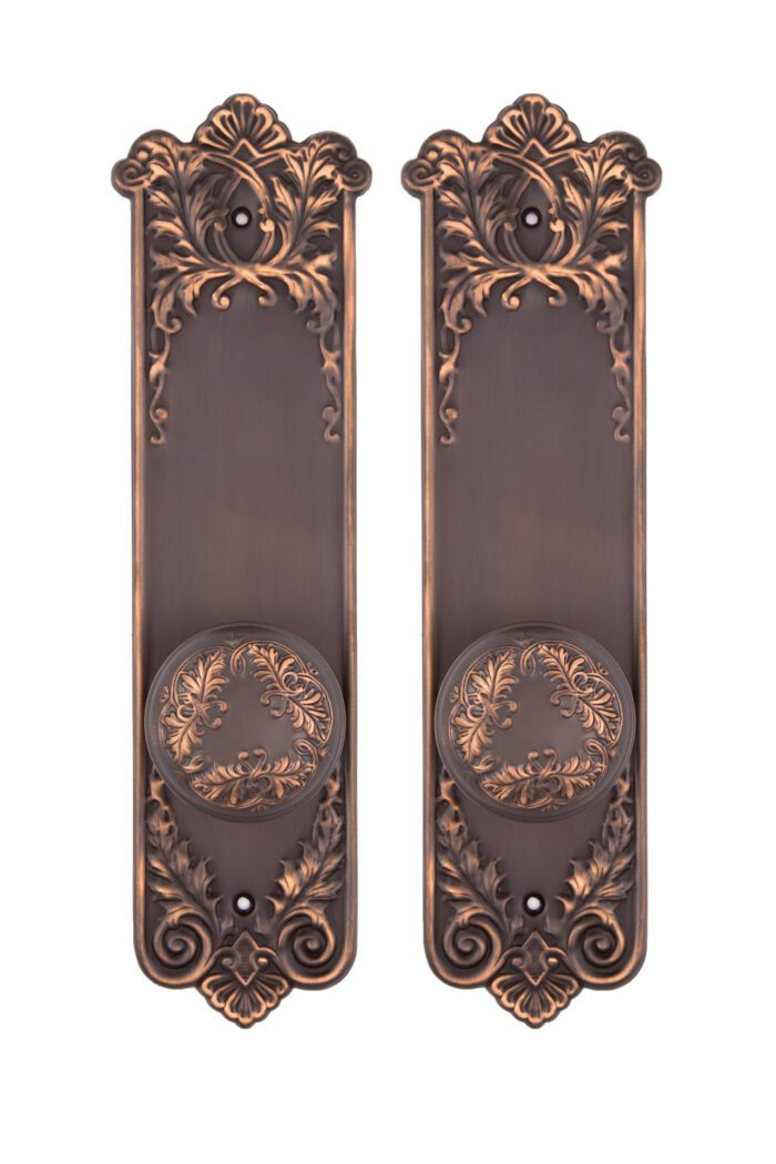 This Neoclassical French inspired pattern is recreated in a pressed bronze and relieved to highlight the exquisite details. This entry set will add lasting beauty to your front door. The set includes the backplates, knobs, spindle, and selected mechanisms.