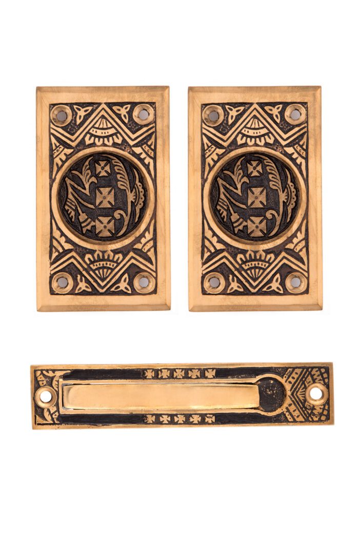 Set includes two passage handles, edge pull, and mounting hardware.