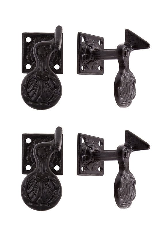 Our Shell Shutter Dogs are a reproduction of an 1850’s antique from Reading Hardware. These are plate mounted and hand forged in wrought iron. The coastal motif is not only decorative, but functional.