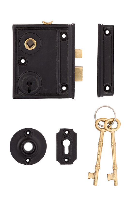 Includes rim lock, keeper, two keys, and mounting hardware.