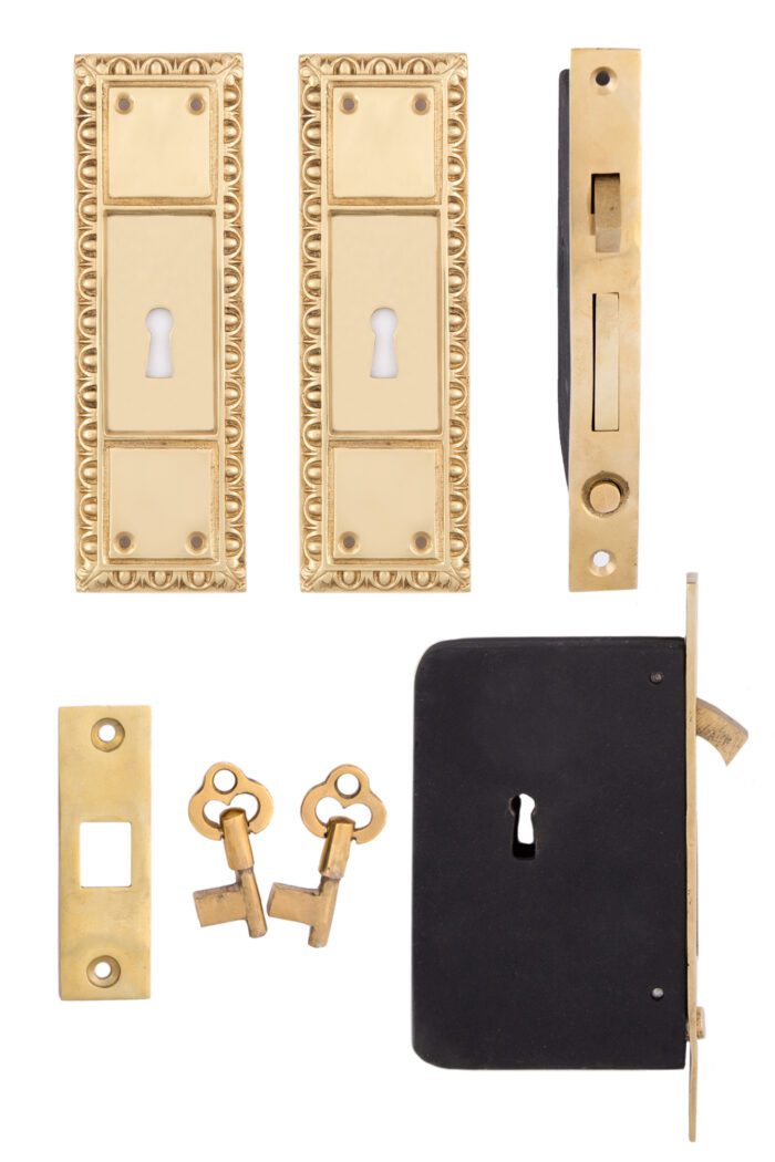 Double set includes two keyed handles, two passage handles, lock, lock receiver, keys, and mounting hardware.